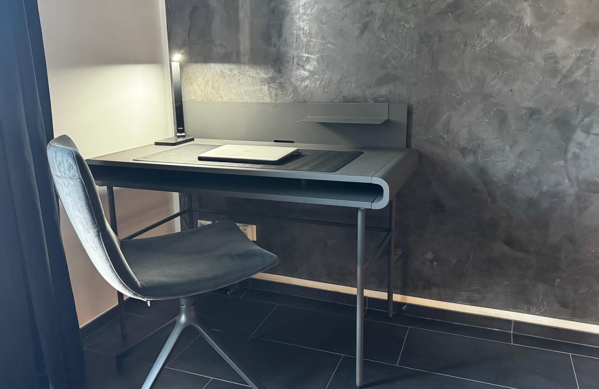 - Wohn-/Schlafbereich: Der Raum ist multifunktional gestaltet und durch eine stilvolle Holztrennwand in Paneel-Optik in Wohn- und Schlafbereich unterteilt. Der Schlafbereich ist mit einem hochwertigen, massiven Holzbett (1,60 x 2 m) ausgestattet und bietet eine luxuriöse und entspannende Schlafatmosphäre. Große Fensterfronten im Wohn- und Schlafbereich ermöglichen einen freien Blick ins Freie, sowohl vom Bett als auch von der Couch aus. Der Wohnbereich bietet ein gemütliches Sofa und zusätzlich einen eleganten Schreibtisch mit passendem Stuhl, der zum Arbeiten oder zum Beantworten privater E-Mails einlädt. Eine kleine Kommode steht ebenfalls bereit und eignet sich ideal zur Lagerung privater Dokumente und persönlicher Gegenstände.