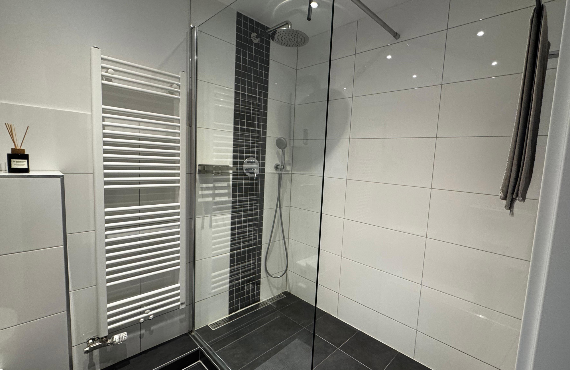 - Badezimmer: Das moderne Bad verfügt über eine elegante, begehbare Dusche mit Rainshower-Duschkopf, die ein luxuriöses Duscherlebnis bietet. Zusätzlich sind ein WC und ein Waschbecken vorhanden, sodass alle Annehmlichkeiten für einen entspannten Start in den Tag bereitstehen.